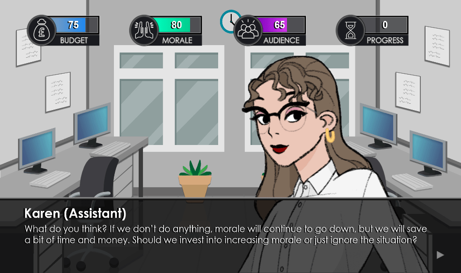 Upon completion of the first section of the game, our group asked a lecturer in the field of game development to try the experiment for themselves and see how they would navigate through the scenarios we provided. We were excited to see that they found the game straightforward and easy to understand. Interestingly, we observed a nuanced decision-making process: in some situations, they chose to play it safe, prioritizing cautious strategies, while in others, they took more significant risks, demonstrating a thoughtful balance between risk and reward that reflected real-world managerial dilemmas. Although we did not conduct a more extensive or formal playtesting phase beyond this point, the development process itself offered valuable insight into how decision-making pressures can influence managerial strategies and lead to creative compromises. Real-world examples reveal how the games industry can sometimes be exploitative, which we incorporated into our game’s narrative. We drew inspiration from reports about companies like Electronic Arts, where employees have described prolonged work hours and poor work-life balance, leading to significant mental health challenges (Gilbert, 2019). One notable instance of how we incorporated a scenario like this in our game was when we came up with a dialogue where the player was given the choice to not remind workers to take breaks, mirroring the common issue of how some employees can forget to use their PTO hours. In other instances, we tried to emphasize the mindset keeping narrative and aesthetic choices safe and simple to avoid extending the budget and audience criticism, as shown in Figure 8.